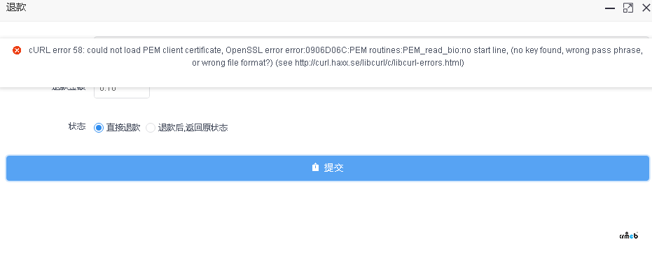 【遇到問題描述】:點擊退款報錯 cURL error 58: could not load PEM client certificate, OpenSSL error error:09