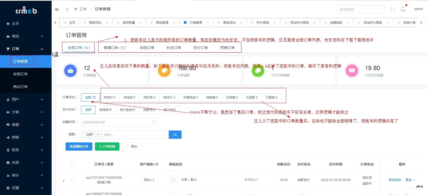 4.4測試版本(4.32也是如此)的訂單列表表頭數(shù)據(jù)混亂,讓人很難看明白,我看4.032老版本的邏輯就很好,新版加入了售后訂單后去掉退款中訂單數(shù)量,破壞了很多原有的邏輯,請看附件圖片,希望官方修復(fù)